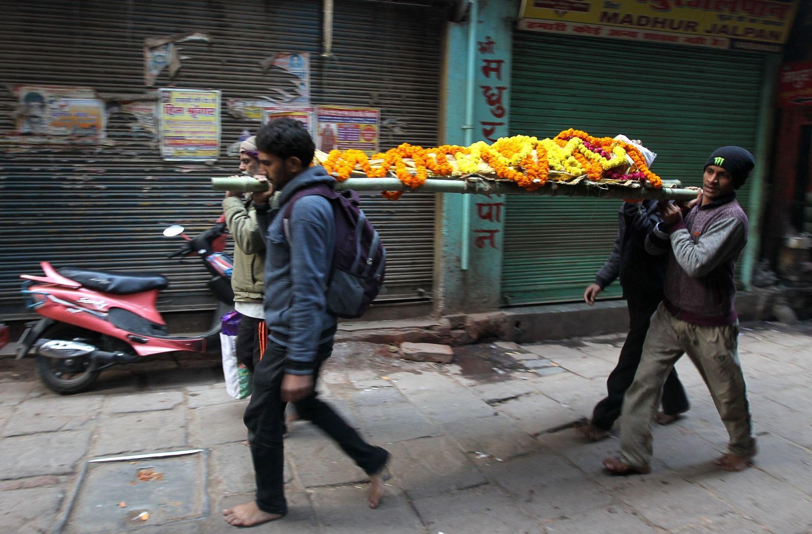 शरीर को अर्थी पर रखा जाता है और फूलों से सजाया जाता है।